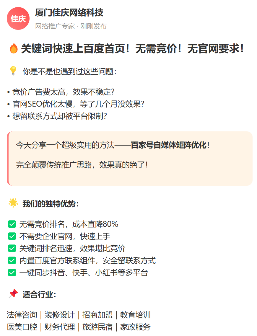 如果以上任何一條戳中了您的痛點,那么請您一定要花2分鐘時間了解這個顛覆性的推廣方式——百家號自媒體矩陣優(yōu)化,它將徹底打破您對網(wǎng)絡(luò)推廣的固有認知!