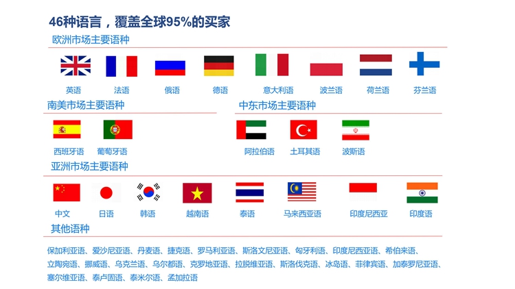 | 語(yǔ)種支持 | 46個(gè)全球商機(jī)語(yǔ)種 | √(增1個(gè)語(yǔ)種1000元) | 可以從谷歌認(rèn)為有交易機(jī)會(huì)的46個(gè)競(jìng)價(jià)語(yǔ)種任選一種作為主語(yǔ)種。 |