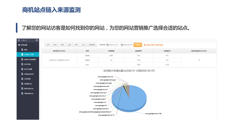 | 智能監(jiān)測(cè)系統(tǒng) | 站點(diǎn)鏈路來(lái)源監(jiān)測(cè)系統(tǒng) | √ | 了解訪客來(lái)源站點(diǎn),分析不同站點(diǎn)的訪客質(zhì)量及投入性價(jià)比。 |