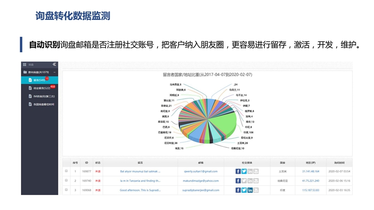 | 詢盤智能社交識(shí)別系統(tǒng) | ×(1000元/年) | 自動(dòng)識(shí)別海外詢盤郵箱注冊(cè)了哪些社交媒體,助力企業(yè)通過(guò)社交互動(dòng)高效提升詢盤轉(zhuǎn)化。 | |