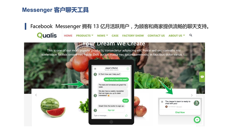 | Messenger社交聊天工具 | ×(2000元/年) | 訪客若通過(guò)Facebook Messenger咨詢,雙方即可建立特定交流通道,從而能進(jìn)行持續(xù)成交跟進(jìn)。 | |