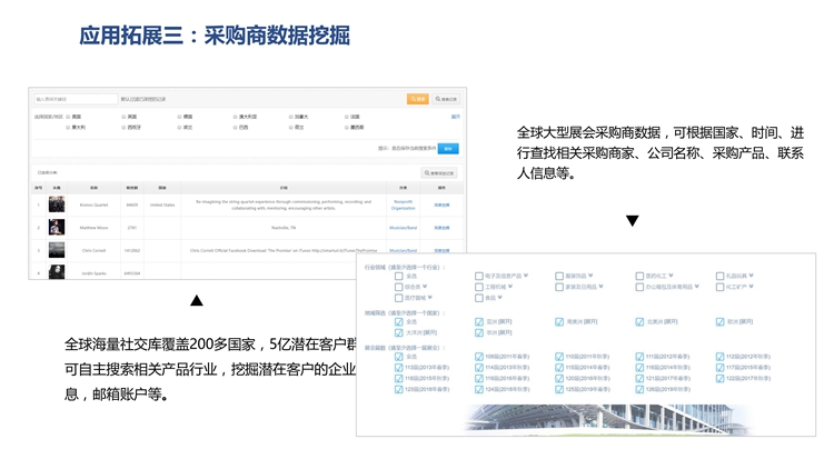 | 采購(gòu)商商機(jī)系統(tǒng) | 展會(huì)數(shù)據(jù)系統(tǒng) | ×(1000元/年) | 全球大型展會(huì)采購(gòu)商數(shù)據(jù),可根據(jù)國(guó)家、時(shí)間、等級(jí)等多維度過(guò)濾查找相關(guān)采購(gòu)商家、公司名稱、采購(gòu)產(chǎn)品、聯(lián)系人信息等 |