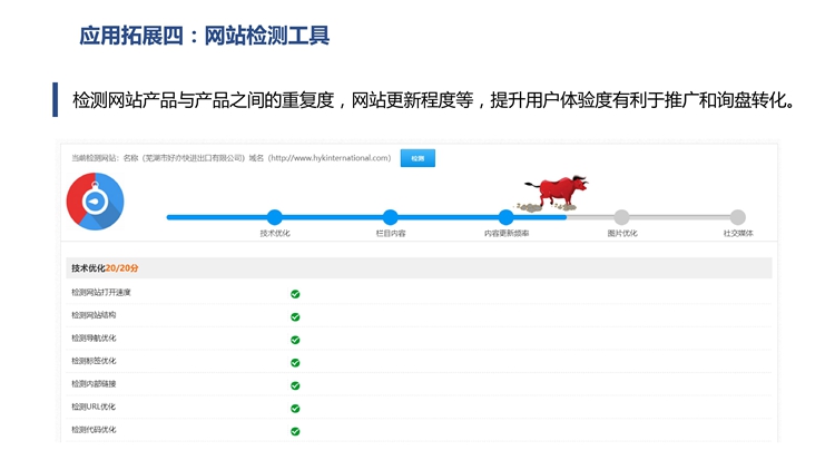 | 智能建站工具 | 資料完成度檢測(cè)系統(tǒng) | √ | 檢測(cè)上傳資料的完整度,提醒企業(yè)未完善的地方及整理效果。 |